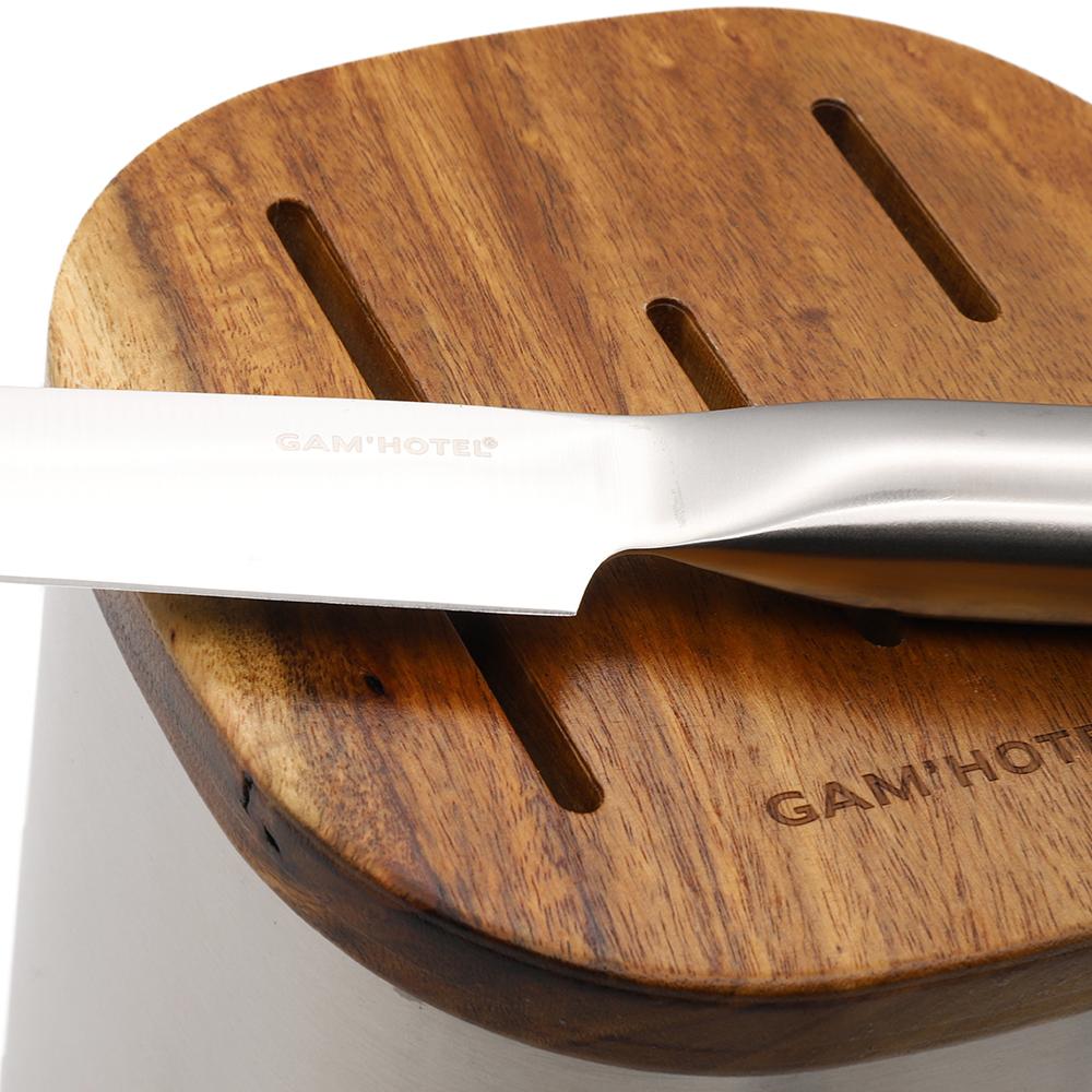 Gam'Hotel, offre toujours une meilleure durabilité et fonctionnalité. Inspirée d’un univers de luxe et crée les objets précieux comme des bijoux. Une ligne pure, moderne, et stylisée qui vous donnera du caractère à toutes les cuisines modernes. LAME EN ACIER INOXYDABLE SS 420J2 : D'un matériel en acier élégant, les couteaux vous offrent une durabilité élevée, 52-53 HRC,Cet acier est utilisé dans l'élaboration de couteaux de plongé haut de gamme pour sa grande résistance mécanique et surtout à l'oxydation. Bon tranchant. Bloc en acier inoxydable et bois d'acacia, un bois durable et économique.
