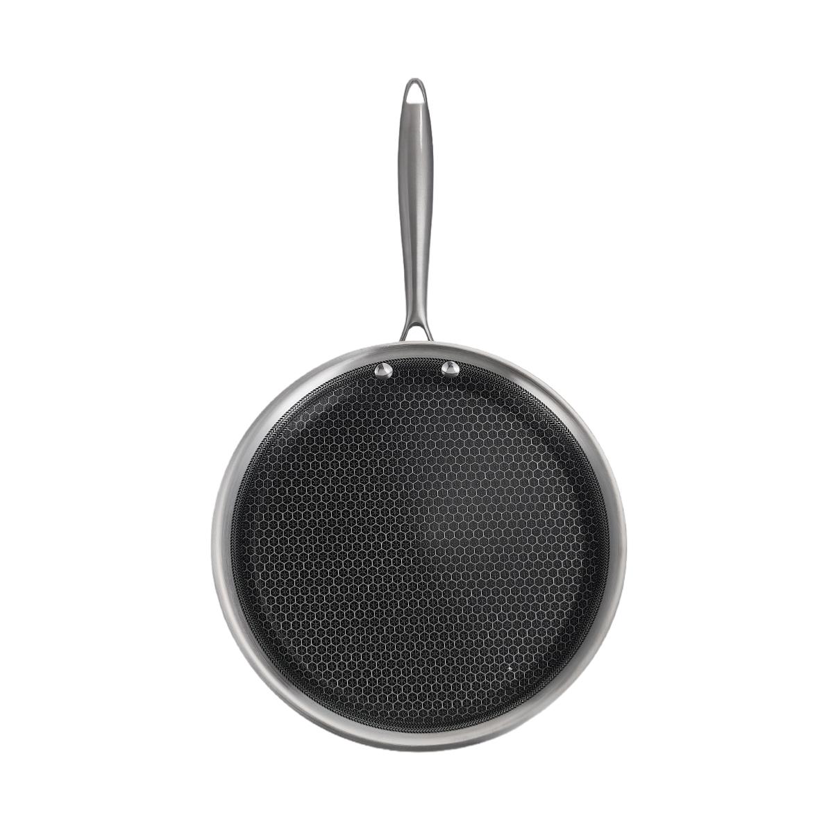 Alliez performance, durabilité et design avec la collection BlackSteel triplex. Conçue en inox 18/8 avec un corps triplex, cette crêpière assure une répartition homogène de la chaleur, du fond jusqu’aux parois, pour une cuisson parfaitement maîtrisée. Son intérieur est revêtu d’un antiadhésif céramique haute performance, sans PFOA ni PFAS, pour une cuisine plus saine et un nettoyage facile. Grâce à la technologie BlackSteel, composée de micro-points en acier inoxydable aux formes géométriques uniques, le frottement des ustensiles est réduit, préservant ainsi la surface antiadhésive et prolongeant sa durabilité. Pensée pour répondre aux exigences les plus élevées, la ligne BlackSteel de Laguiole est le choix idéal pour les passionnés de cuisine à la recherche de qualité, de précision et d’élégance.