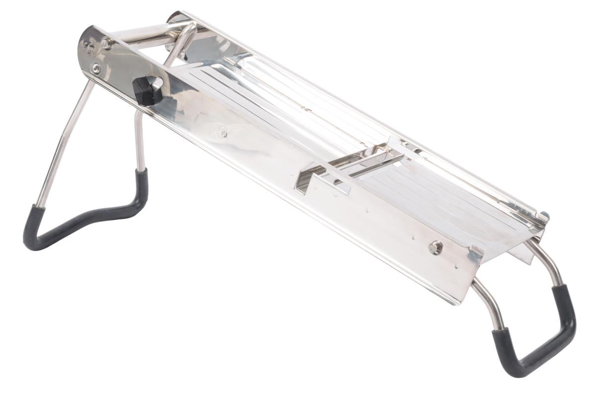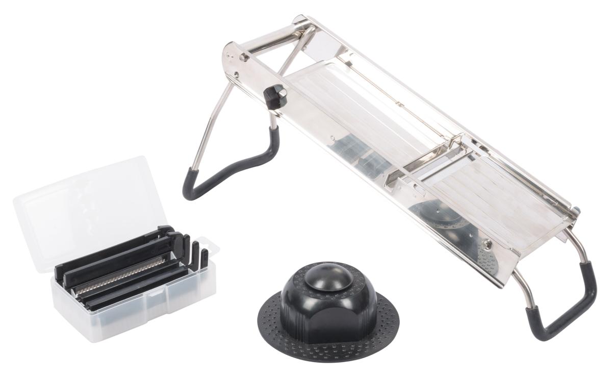 Une mandoline professionnelle, robuste et indéformable avec un châssis en acier inoxydable 18/8 permet de couper légumes et fruits en tranches lisses ou gaufrées ou en bâtonnets, elle est livrée avec 5 lames: