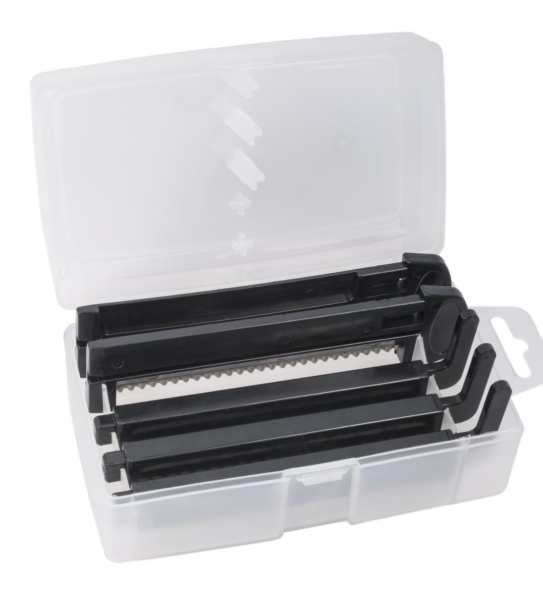 Support de lames encastré sous le châssis. Lavage des lames à la main. Le châssis passe au lave-vaisselle.