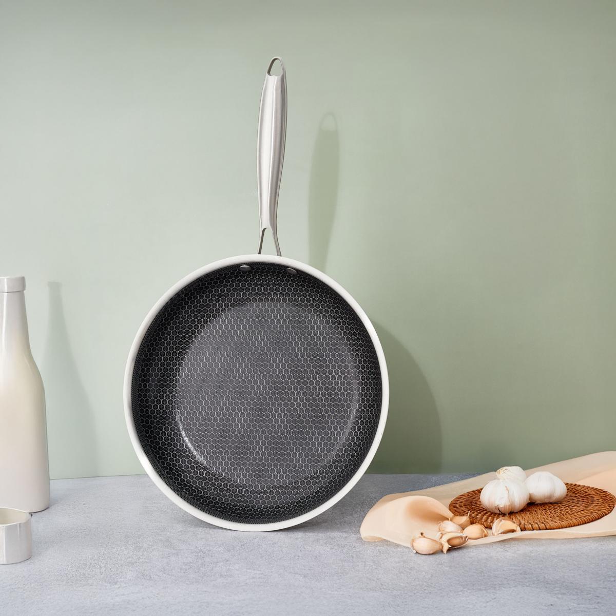 Alliez performance, durabilité et design avec la collection BlackSteel triplex. Conçue en inox 18/8 avec un corps triplex, cette poêle assure une répartition homogène de la chaleur, du fond jusqu’aux parois, pour une cuisson parfaitement maîtrisée. Son intérieur est revêtu d’un antiadhésif céramique haute performance, sans PFOA ni PFAS, pour une cuisine plus saine et un nettoyage facile. Grâce à la technologie BlackSteel, composée de micro-points en acier inoxydable aux formes géométriques uniques, le frottement des ustensiles est réduit, préservant ainsi la surface antiadhésive et prolongeant sa durabilité. Pensée pour répondre aux exigences les plus élevées, la ligne BlackSteel de Laguiole est le choix idéal pour les passionnés de cuisine à la recherche de qualité, de précision et d’élégance.