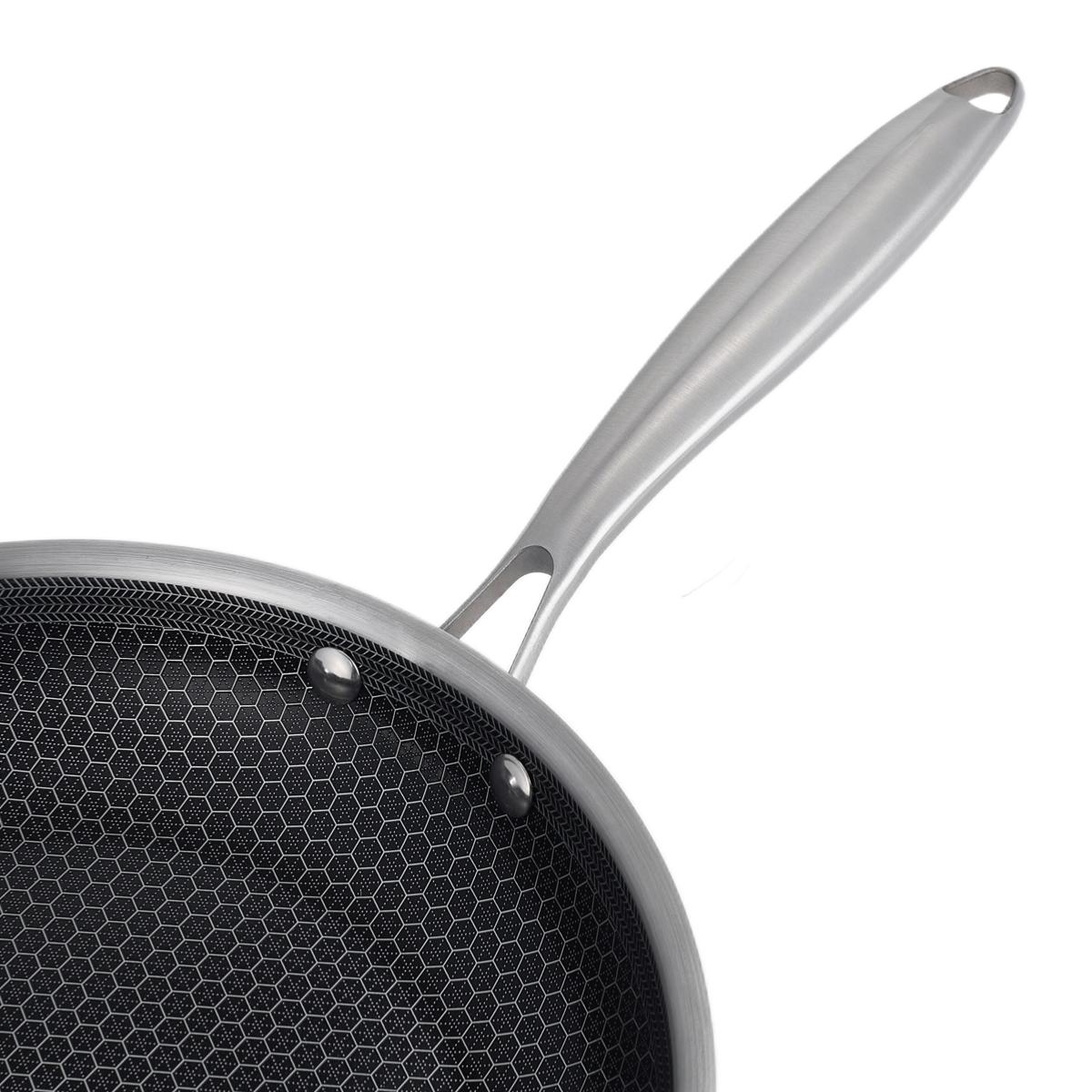L’intérieur est doté d’un revêtement antiadhésif céramique, sans PFOA ni PFAS. La technologie BlackSteel, avec ses formes géométriques en micro-points d’acier inoxydable, réduit le frottement des ustensiles et renforce la durabilité du revêtement antiadhésif multicouche haute résistance.